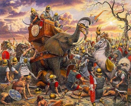 Rome saw them as a threat and not entirely wrongly, because the Carthaginians annexed Sicily - as did all the other peoples on the Mediterranean in turn. And then the Carthaginian general Hannibal was a definite pain-in-the-ass for the Roman army. He landed in Spain at Cartagena - another Phoenician trading post - in 218 BC, trotted south of the Pyrenees, through France, over the Alps and down into northern Italy - with elephants! It was the equivalent of a tank against foot soldiers in those days, and they plowed right through a Roman shield-and-spear fortress like an axe through butter. He came close to overthrowing the Roman Empire but finally lost at Cannae in southern Italy and had to return home. Then came the destruction of Carthage in the Third Punic War. Punia was the Tunis of that time. Punia was punished.