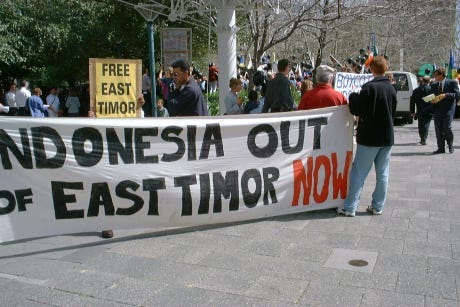 The liberation of East Timor is a peculiar form of reverse imperialist liberation. The Portuguese occupied the western part of the island until 1975 - long after the rest of Indonesia was independent. Then the Indonesians occupied the eastern part, and the population was cheated of a real liberation. In 2002, they kicked out both the Portuguese and the Indonesians.