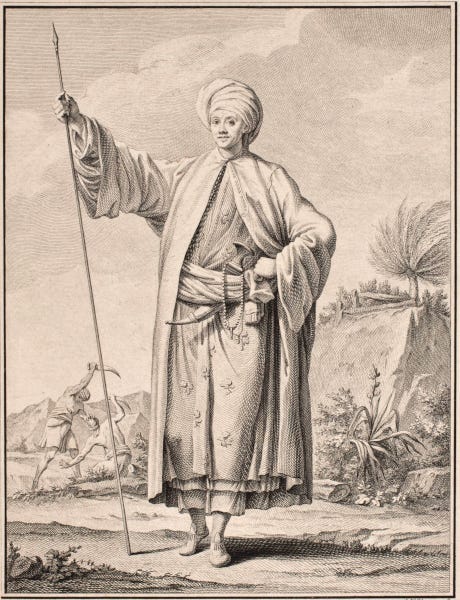Niebuhr - a German cartographer in Danish service - was a traveler of rare quality. He transformed himself into an Arab by learning the language and wearing their clothes. He spoke directly to and with them. This meant that he survived, while the members of his traveling party died, several of them. They hated their crappy job, while Niebuhr loved it. There is no other way to explain his luck.