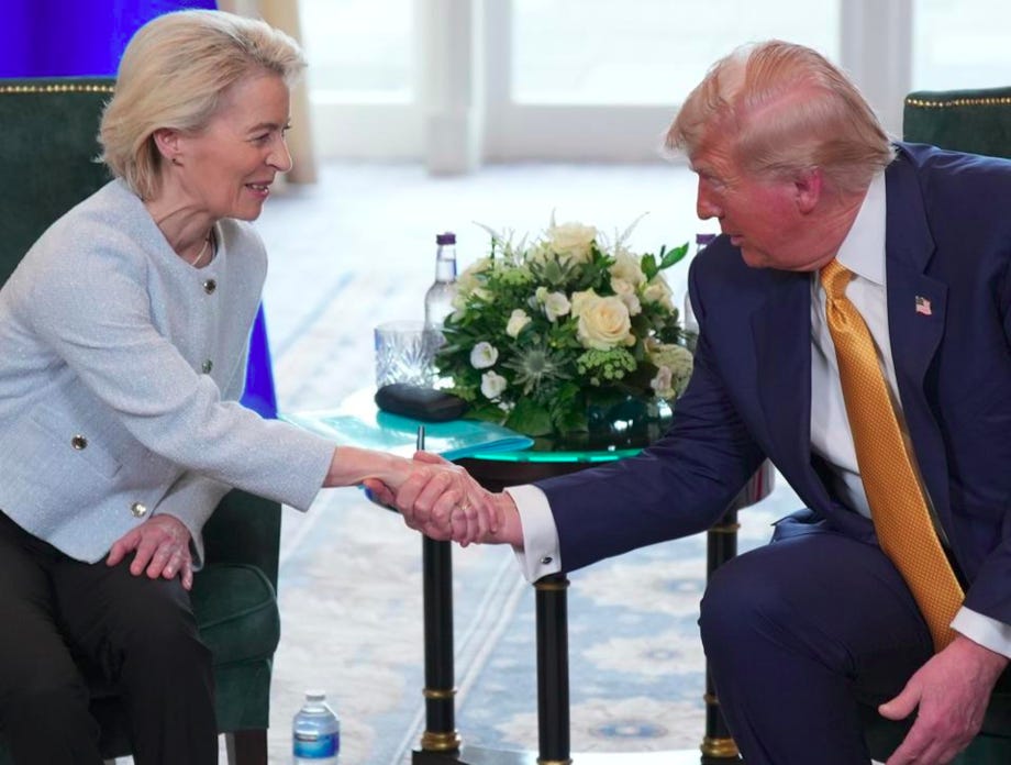 And now the European leaders have become like this clown in Ukraine. They behave in the same puppet-like manner. The EU summit consists of puppets. You may remember the meeting between Donald Trump and Ursula van der Leyen in Scotland, where he sits and dictates to the lady what she should think and do. That’s right Ursula, that was good, but now I’m going to play golf.