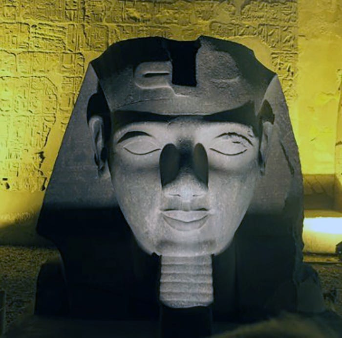 When traveling in Egypt, one encounters the ‘face’ along the way. He is called Ramses II. He is found in full shape, in oversize, as a bust, as a face on a plinth. If it’s a big face, it’s smiling. Why? Imagine a face seen from the front, which in reality had to be experienced from below because it was huge and located high up. From below, the face looks offended-sour-angry if one does not compensate from the start and let it smile the inner Buddha smile. This optical phenomenon has been known, but it really arrives impressively if one analyzes the symmetry of the face.