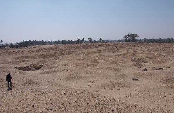 That’s not the only thing abnormal about the place. It is submerged below ground level, and in the surrounding landscape there is silt, material deposited by flowing water. Geologists can show that the Nile has moved to the east and that it was huge and wide.