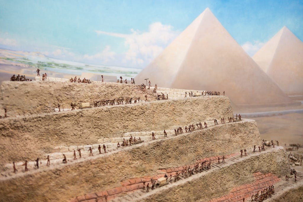 The Great Pyramid of Giza was built by 10,000 slaves sweating around the clock and pulling a string up a giant sandbox ramp, which had to be rebuilt every time a row was reached.
