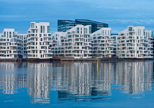 Moving outward, the model is the same, but here something strange happens. First, it’s terrifying to move around neighborhoods of all steel-aluminum-glass-concrete, all boxes equipped with balconies of course, although no one uses them. Streets after streets of streamlined boxes of at least 7-storey complexes, all looking alike, although the architectural firms would be offended by the statement. Only companies in the Bjarne Ingels league are allowed to break the box pattern, but in reality they just make crooked, slanted or round boxes instead of straight. Right now, for example, we are seeing the round trend at Islands Brygge, after a couple of round concrete monsters at the Slangebroen (snake bridge) from Fisketorvet (it came later) were renovated from the silos in the old soy cake factory. Quite easily inspired by the renovation of the brewery Carlsberg’s old grain silo, which has also become a tower of Babel for the wealthy. Renovating the concrete shell of the silos and transforming them into ultra-luxury apartments has cost twice as much as building something similar from scratch - but who cares, when today you can rent out an apartment for between 25-40,000 per month via built-in story count.