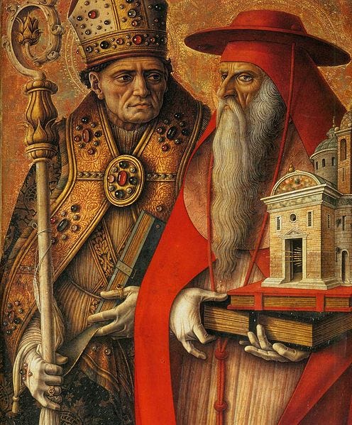 A couple of church fathers sticking their heads together, Augustine and Hieronimus