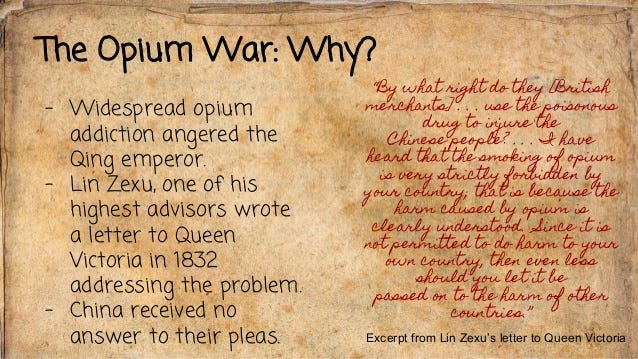 The Chinese Emperor addresses the double standards of the English in his letter to Queen Victoria. But what the Emperor might not have understood was that the opium wars were the Chinese encounter with a gloomy, occult agenda, a death cult that sacrificed people while making money.