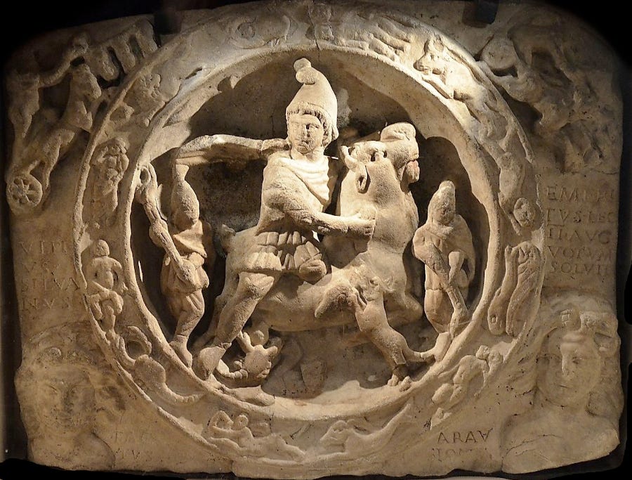 When Mithra slaughters the bull, it is a picture of man overcoming fate. The zodiac is fate, for the stars and constellations are fate, the deterministic element in the Cosmos and human life. We now take fate into our own hands.