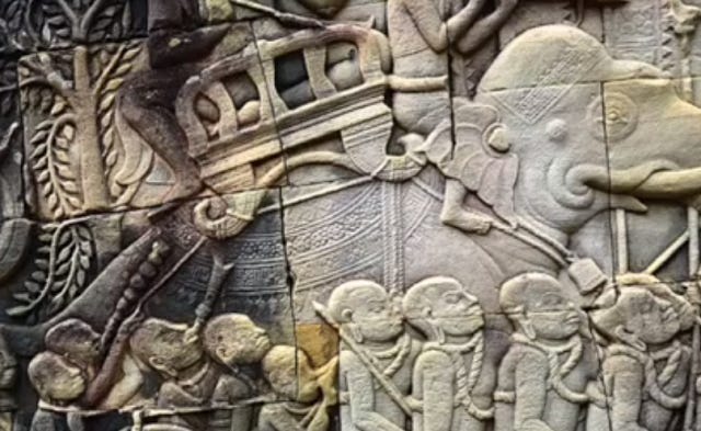 The Khmer kingdom itself is dated to between the years 802-1131. We do not necessarily have to doubt that, even though we have gradually lost confidence in the ability of historians to date. For the building style, with the large puzzle megaliths, belongs to a much older civilization. It is quite conceivable that it is like in Egypt, where the temple constructions themselves, the hypostele halls, are older than the cartouches, the Egyptian form of geo-polymer, laid on the outside. Architecture is sometimes like a palimpsest – a painting painted on top of another painting.