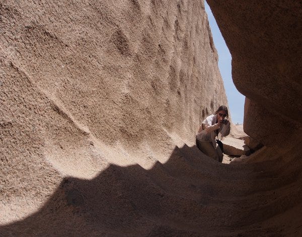 Regular scratch marks from power tools around the unfinished obelisk at the quarry in Aswan. Own photo from a tour of Egypt with Chris Dunn, Yousef Awyan, Stephen Mehler
